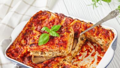 Lasanha ao forno: camadas de massa pré-cozida alternam-se com alcachofra salteada, molho branco caseiro e queijos muçarela e parmesão. A finalização é feita no forno a 180 °C por 25 minutos.