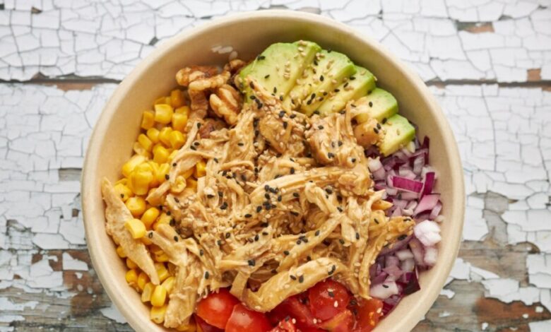 3. Poke de frango desfiado – Prepare 2 xícaras de arroz branco, desfie 400 g de peito de frango cozido com alho e louro e tempere com molho de soja, azeite, óleo de gergelim, limão, mel e gengibre. Monte a tigela com arroz, frango, milho, tomate-cereja, cebola-roxa e fatias de abacate; salpique gergelim branco e preto.