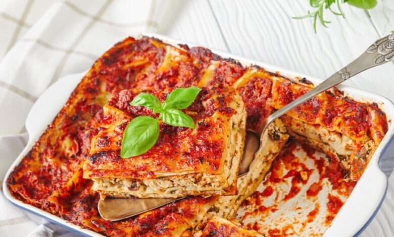 Lasanha de tofu e shiitake: camadas de massa sem ovos se intercalam com recheio cremoso de cogumelos, tofu, molho de tomate e queijo de castanha-de-caju.