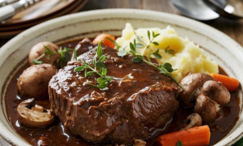 Sele 800 g de acém em 2 c.s. de azeite. Reserve. Na mesma panela, refogue cebola, alho, cenoura e 2 c.s. de extrato de tomate. Volte a carne, junte 500 ml de vinho tinto, 300 ml de caldo, louro e tomilho. Cozinhe por 2 h 30 em fogo baixo, adicionando 200 g de cogumelo nos 20 minutos finais. Sirva com purê feito de 600 g de batata, manteiga, leite morno e noz-moscada.