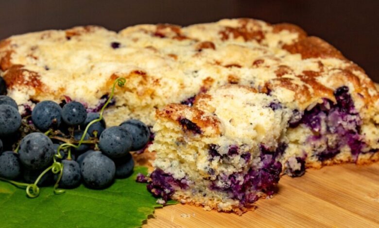Cuca de uva: adicione 1 ½ xícara de uva preta debulhada sobre a mesma massa já crescida. Polvilhe a farofa (agora com 3 colheres de manteiga) e asse por 35-40 min, até que a fruta libere calda e a superfície doure.