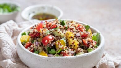 Para complementar, prepare um vinagrete fresco com 1 tomate, ½ cebola roxa, ½ pimenta dedo-de-moça, azeitonas e salsinha a gosto. Tempere com sal, azeite e vinagre. Enquanto o cuscuz cozinha, doure cubos de queijo coalho na frigideira até criar crosta dourada e interior macio.