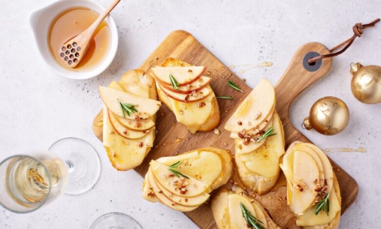 Crostini de brie com pera, mel e nozes-pecã – Pincele fatias de baguete com azeite e torre a 180 °C por 8 a 10 min. Sobre cada torrada quente, coloque queijo brie, lâminas finas de pera, um fio de mel e nozes-pecã picadas. Aromatize com ramos de alecrim e sirva ainda morno.
