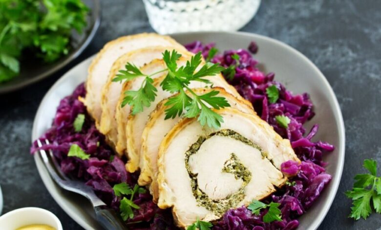 Recheie a peça com a pasta de ervas, enrole e amarre. Sele, incorpore o caldo, cozinhe 25 min e asse 40 min a 180 °C. Acompanhe com repolho roxo refogado em cebola, azeite, vinagre de maçã, sal e pimenta.