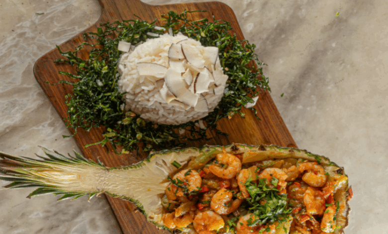 Ensopado de camarão no abacaxi – Camarões temperados com limão e pimenta-do-reino são rapidamente grelhados e depois combinados a chuchus, tomate, ervas frescas e pimenta dedo-de-moça. Parte da polpa do abacaxi é incorporada ao molho, que ganha leve acidez. Acompanhado por arroz de coco – feito com 100 ml de leite de coco e coco ralado – e couve crispy, o ensopado é servido dentro da própria fruta, criando apresentação tropical e sofisticada.