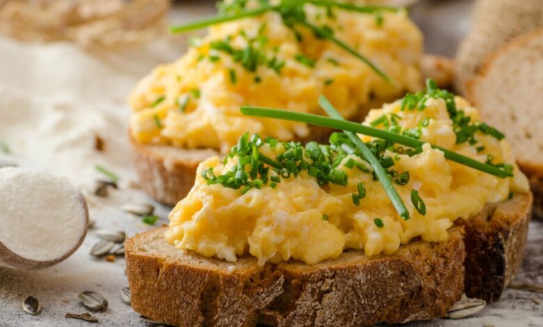 Ovos mexidos com ricota – quatro ovos batidos se unem a ricota, sal e pimenta. Cozidos lentamente, ganham cebolinha fresca e podem acompanhar pão integral.