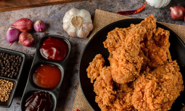 3. Frango frito crocante – Coxas e sobrecoxas temperadas com alho e especiarias recebem empanado triplo de farinha de trigo, farinha de milho e cereal de milho triturado, resultando em casquinha extra crocante.
