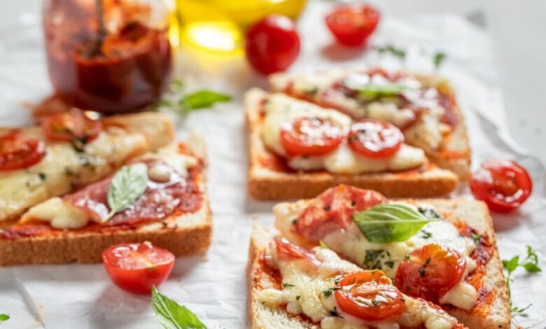 Cubra 4 fatias de pão com 1 colher de molho, 200 g de muçarela e tomate-cereja. Tempere com orégano e azeite. Asse por 6 min a 180 °C.