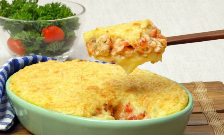 Bastam 600 g de batata para o purê e 500 g de camarão salteado com alho, cebola, tomates e 1 colher de extrato de tomate. O toque cremoso fica por conta de 1/2 xícara de requeijão. Gratine a 200 °C por poucos minutos, mantendo o camarão suculento. Saiba mais sobre a origem desse prato no verbete da Wikipédia, referência em culinária brasileira.