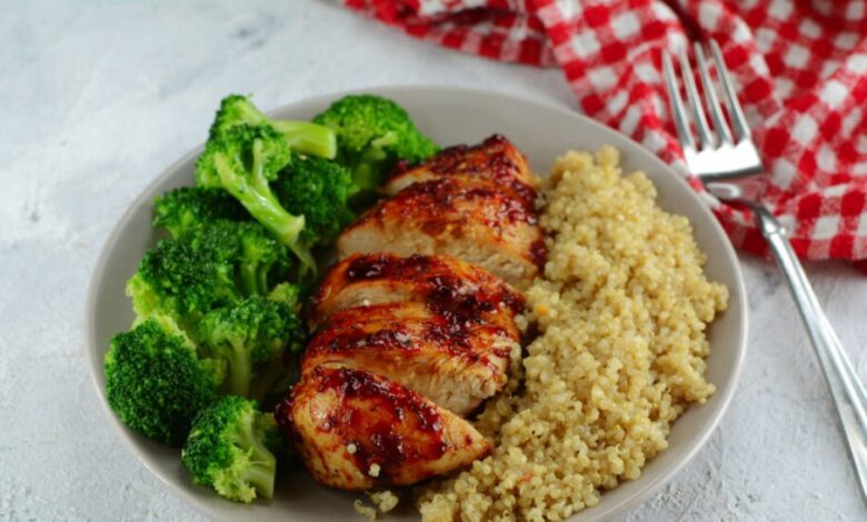 4. Quinoa com frango e brócolis – Cozinhe 1 xícara de quinoa até secar. Tempere 1 peito de frango com suco de limão, sal e pimenta. Doure cebola e alho em 2 colheres (sopa) de azeite, frite o frango e sirva com 2 xícaras de brócolis cozidos.