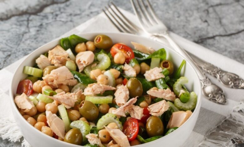 Salada de grão-de-bico com atum – Pepino japonês, tomate-cereja, salsão e azeitona reforçam crocância, enquanto molho de azeite, limão-siciliano e mostarda dijon potencializa o frescor. O atum em pedaços é misturado delicadamente para preservar textura.