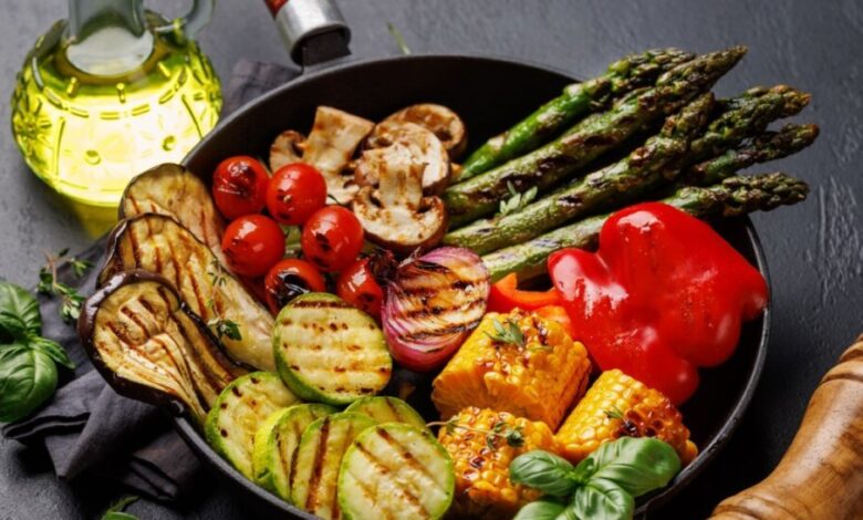 Legumes e cogumelo paris: berinjela, abobrinha, pimentão, aspargo, tomate-cereja, milho e cebola-roxa recebem só azeite, limão e pimenta. Grelhados em etapas, mantêm textura al dente e finalizam com folhas de manjericão.