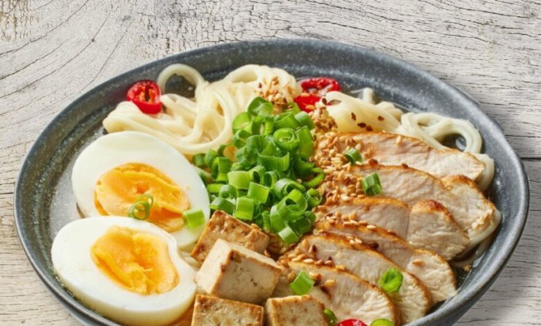 Lámen com frango e tofu: doure 150 g de peito de frango com 1 colher (chá) de óleo de gergelim e 1 colher (chá) de gengibre. Adicione 3 xícaras de caldo de frango e cozinhe 10 min. Cozinhe 100 g de macarrão próprio por 7 min e doure 100 g de tofu em cubos. Em tigela funda, monte macarrão, frango, tofu, 1 ovo cozido ao meio, cebolinha e gergelim.