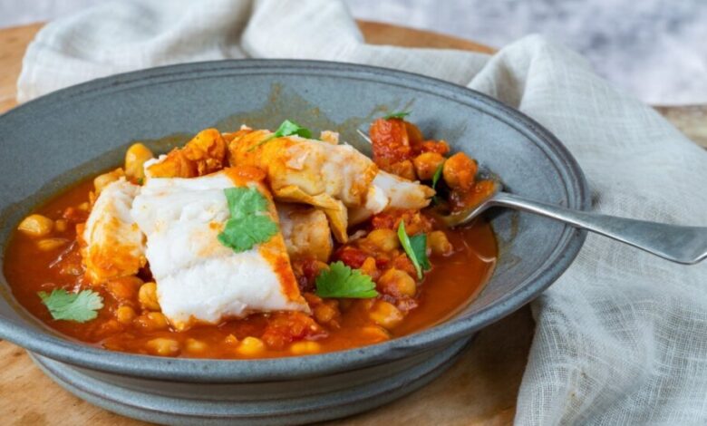 3. Ensopado de peixe com grão-de-bico – Postas de peixe branco marinadas em limão, páprica e cominho cozinham sobre molho de tomate pelado, cúrcuma e leguminosas, pronto em menos de dez minutos.