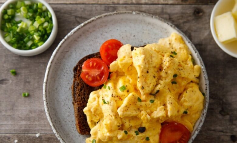 Bata levemente 3 ovos com 2 colheres (sopa) de leite desnatado, sal e pimenta. Em fogo baixo, mexa devagar em frigideira untada com 1 colher (sopa) de azeite até obter consistência cremosa. Sirva sobre 1 fatia de pão integral tostado e finalize com tomates-cereja cortados ao meio e cebolinha.