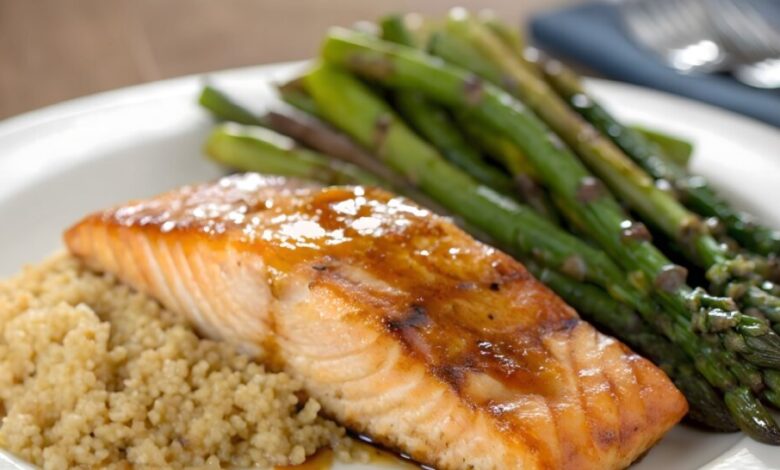 Salmão grelhado, quinoa e aspargos ao forno – Marinados em mel, limão e azeite, os filés de salmão chegam ao ponto em cerca de sete minutos de frigideira. Enquanto isso, a quinoa cozinha em 15 minutos e os aspargos assam por até 15 minutos a 200 °C, compondo refeição leve e sofisticada.